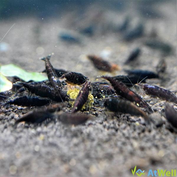 チェリーシュリンプの改良品種です。体色は全身がダークブラウン(こげ茶)の個体と全身ブラックの個体がおり、体色には個体差があります。 体長約1.3cm〜1.8cmのお届けとなります。