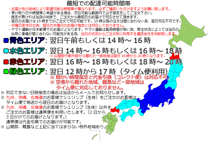 (注文内容、お届け先、希望時間帯、配送料金などを考慮して当店で最適な業者を選択致します。業者の指定がある場合は注文ページの自由記入欄でお知らせください。※北海道、九州、沖縄、一部離島はゆうパック限定とさせていただきます。)