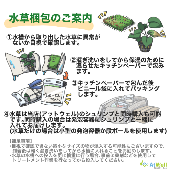 | 用品や水草のみの発送について(注文内容にシュリンプが含まれない場合) | ・用品や水草は通常便にて発送します。 ・本州、四国は翌日到着が可能です。 ・九州、沖縄、北海道は発送から2日後の到着です。 ・5,200円以上のご購入で送料が無料となります。 (九州、沖縄、北海道、一部離島はゆうパック配送条件となります。) |